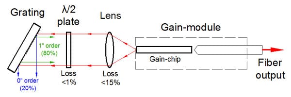該設(shè)備包括帶有彎曲條紋的“C型”增益芯片。條紋傾斜的刻面專為外部反饋而設(shè)計(jì),并具有深層 AR 涂層,從而使芯片波導(dǎo)的背反射極低。它確保了自激的阻斷,并消除了在外腔系統(tǒng)中操作時(shí)與復(fù)合腔相關(guān)的問題。這導(dǎo)致在整個(gè)調(diào)諧范圍內(nèi)具有高邊模抑制比 (SMSR) 的非常精細(xì)的譜線。具有垂直條紋的刻面具有適當(dāng)?shù)姆瓷渎剩ㄍǔT?5-15% 的范圍內(nèi)),以同時(shí)提供寬波長調(diào)諧和高輸出功率。標(biāo)準(zhǔn)器件中這一方面的反射針對在外腔設(shè)置中的操作進(jìn)行了優(yōu)化,該設(shè)置為芯片提供了有效的反饋(約 50%)(如圖所示)。對于反饋較低的方案,我們建議使用在刻面上具有不同涂層的定制設(shè)備,以提供優(yōu)化的反射。